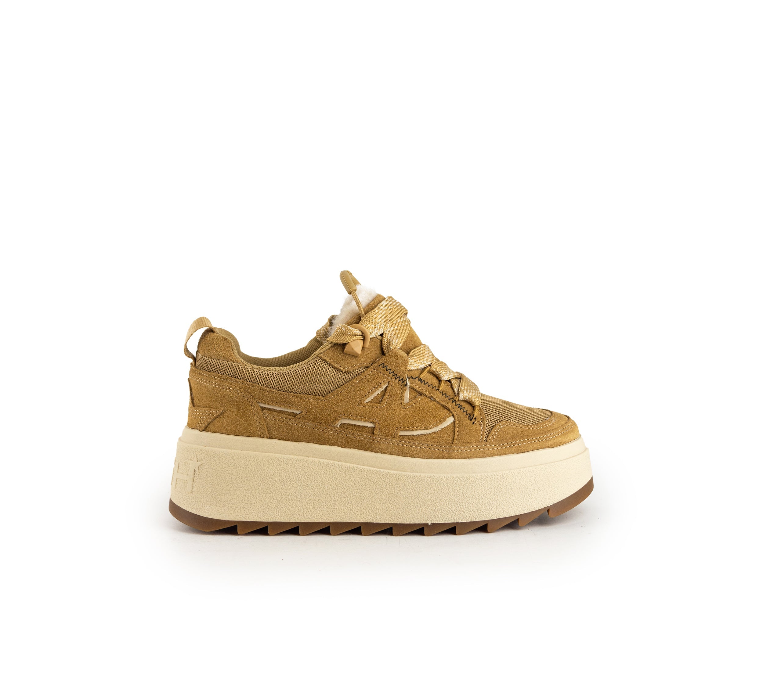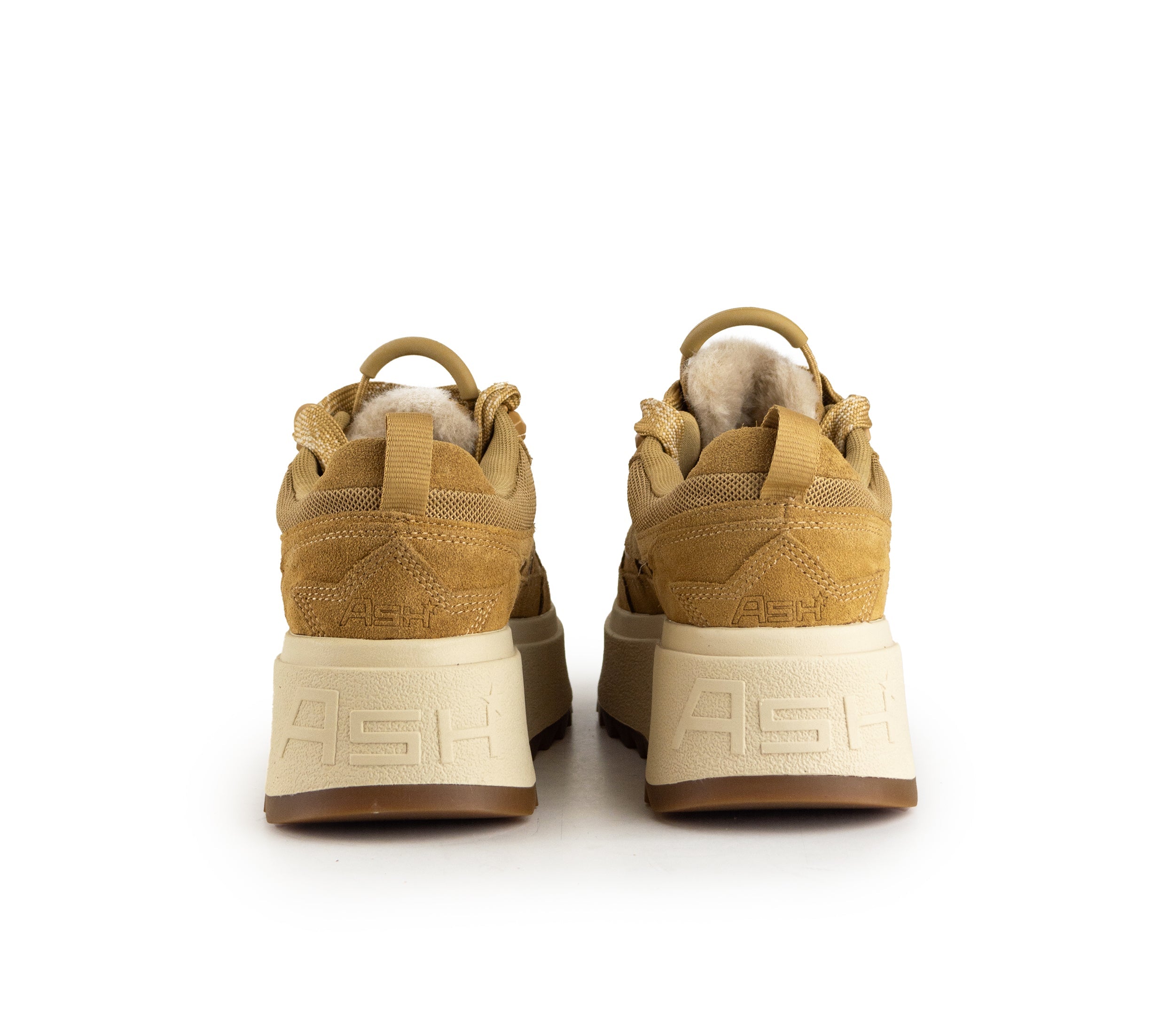 Le sneakers Ash Movie in color cammello presentano una raffinata pelle scamosciata abbinata a inserti in mesh per un design contemporaneo. I maxi lacci in cotone a trama larga esaltano lo stile, mentre la punta arrotondata e le cuciture a vista conferiscono carattere. La fodera e la soletta sono realizzate in tessuto tecnico traspirante, garantendo comfort. La maxi suola chunky in gomma, con battistrada dentellato, offre stabilità, completata dal logo ASH in rilievo sul retro e un tacco di 6,5 cm. Vestibilità regolare. Modello MOVIE BIS 01 | S-152140-001.