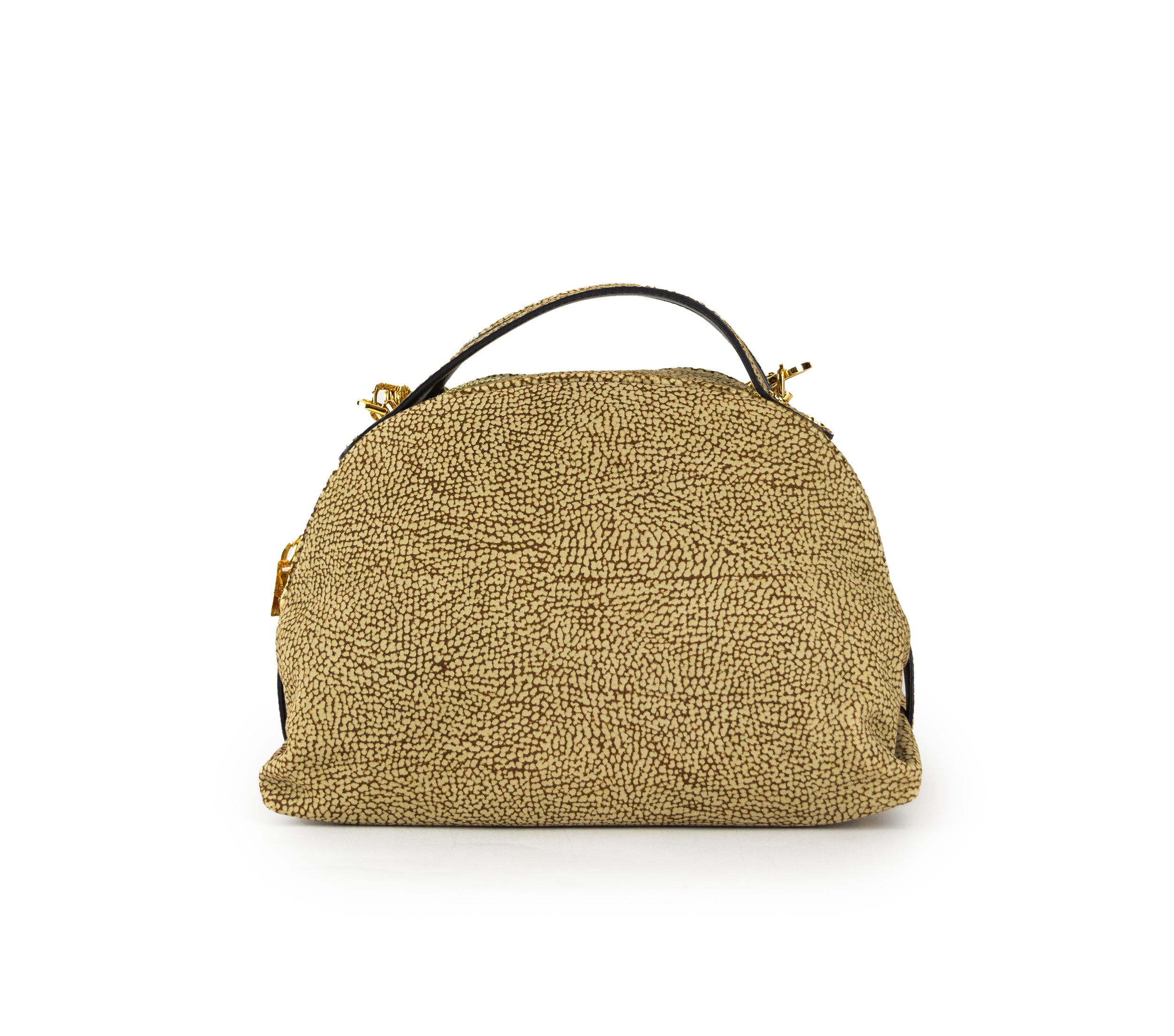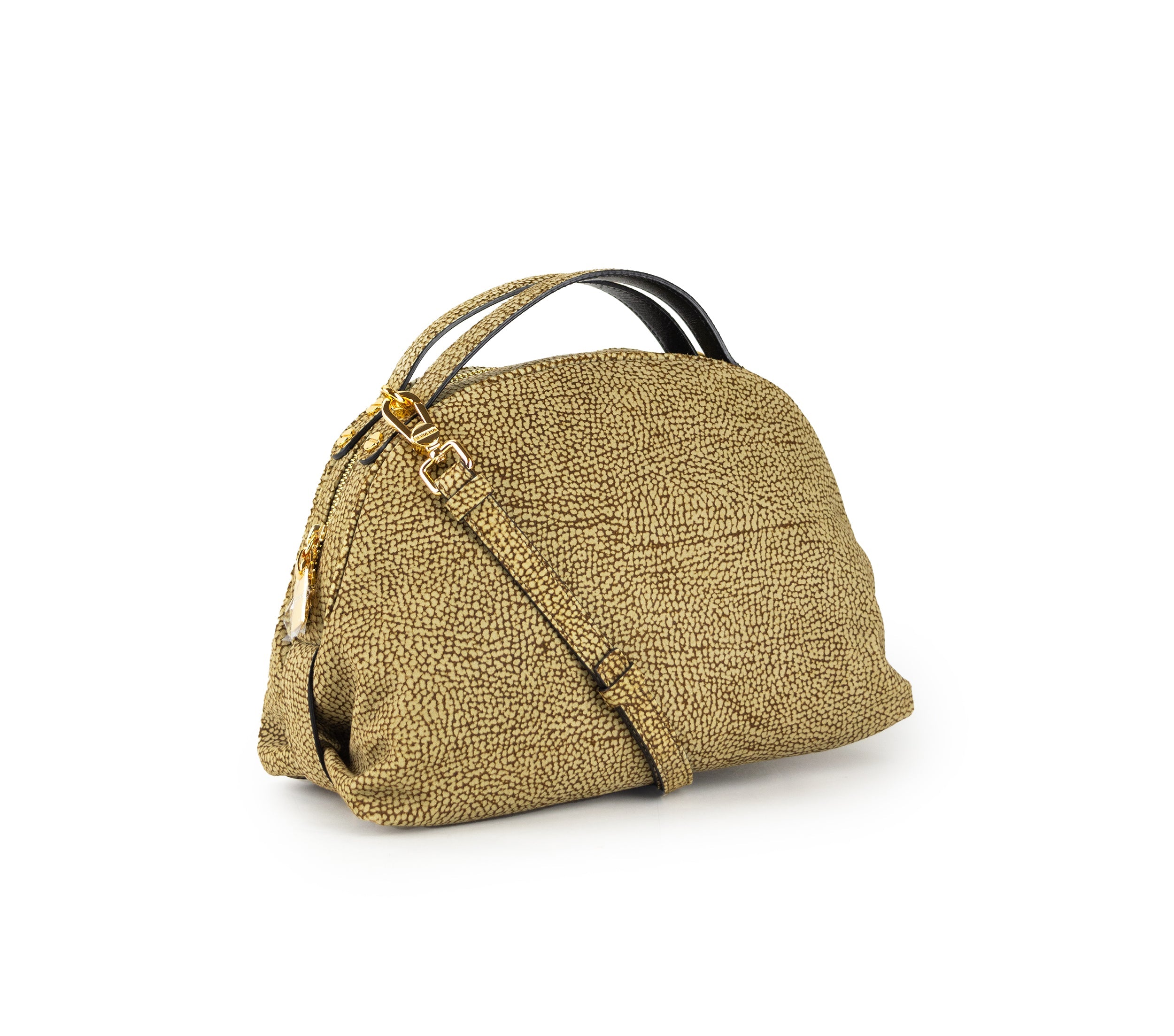 Realizzato in misura media, questo Bauletto in camoscio si distingue per la chiusura con zip a doppio cursore, arricchita da una placchetta logata e dettaglio a vite. Dotato di tracolla regolabile e removibile, presenta un interno funzionale con tasca a zip e tasca aperta. La fodera è composta da tessuto riciclato e le metallerie sono in oro. Prodotto con maestria in Italia.