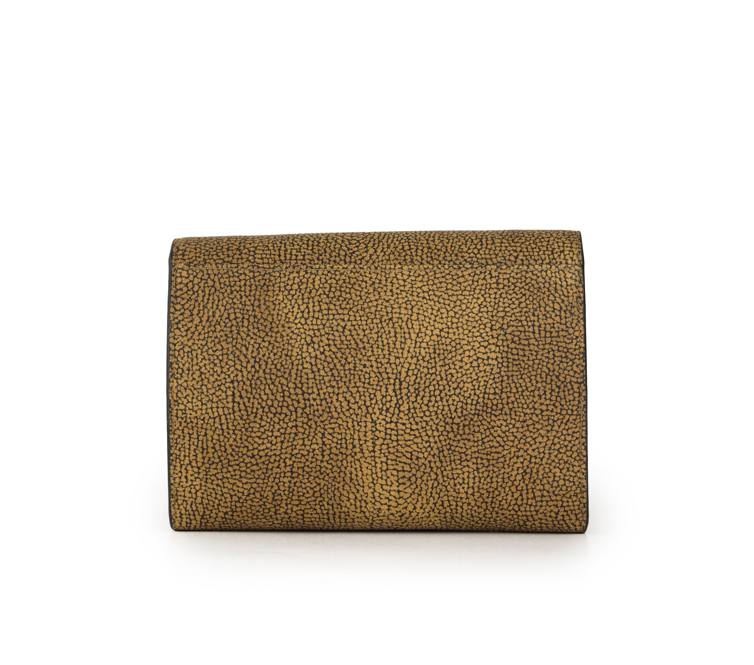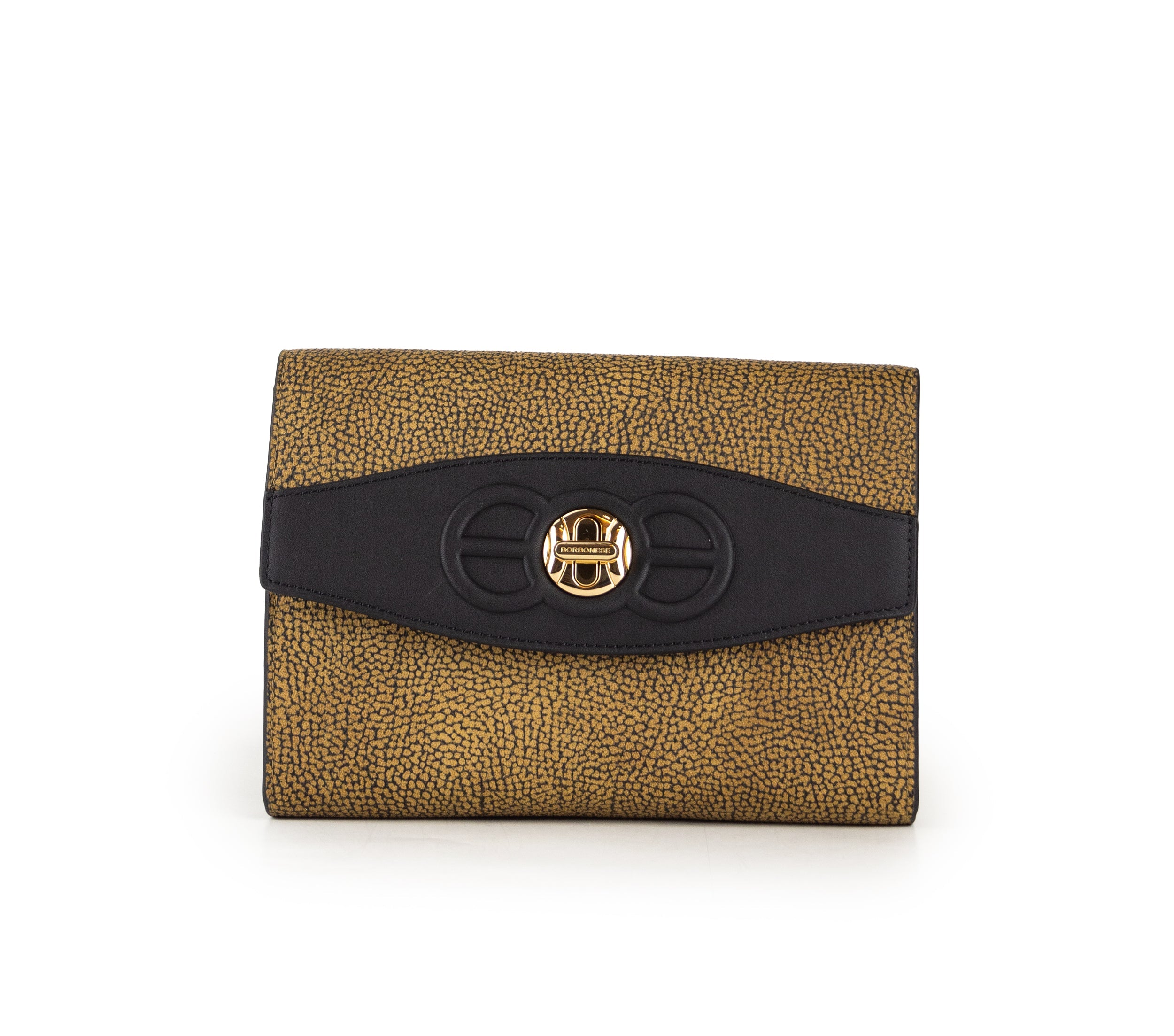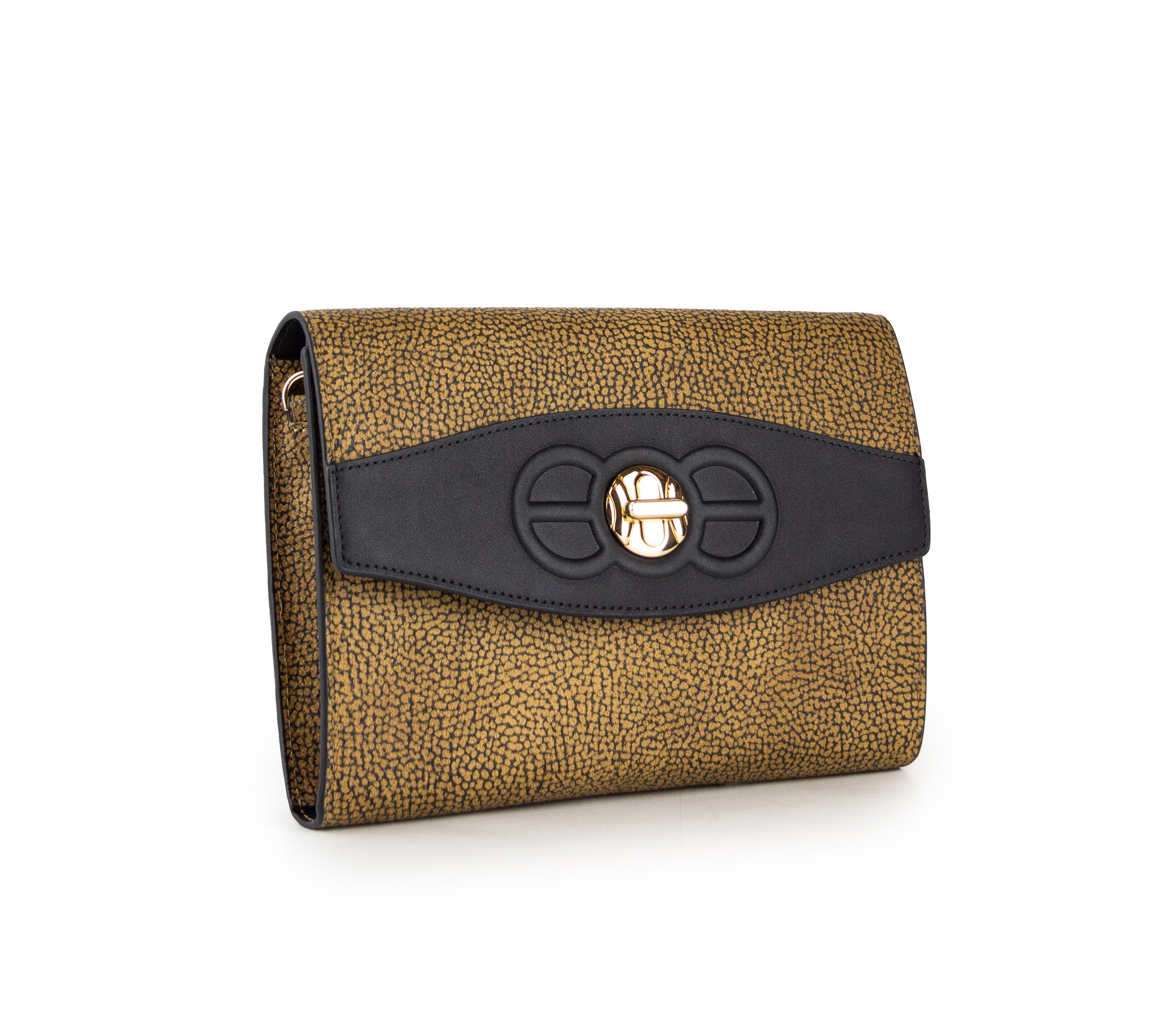 Realizzata in tela rivestita Op con rifiniture in pelle, questa borsa presenta una fodera interna in tessuto jacquard riciclato. È dotata di una chiusura esterna con girello logato, una tasca esterna aperta, e all’interno una tasca con zip in metallo e tirazip in pelle, oltre a una tasca aperta e una parete in pelle organizzata con quattro scomparti per carte di credito. Il cinturino da polso in tela stampa Op e la tracolla rimovibile in tela rivestita Op con catena metallica completano il design, impreziosito da metallerie in oro chiaro. Taglia medium.