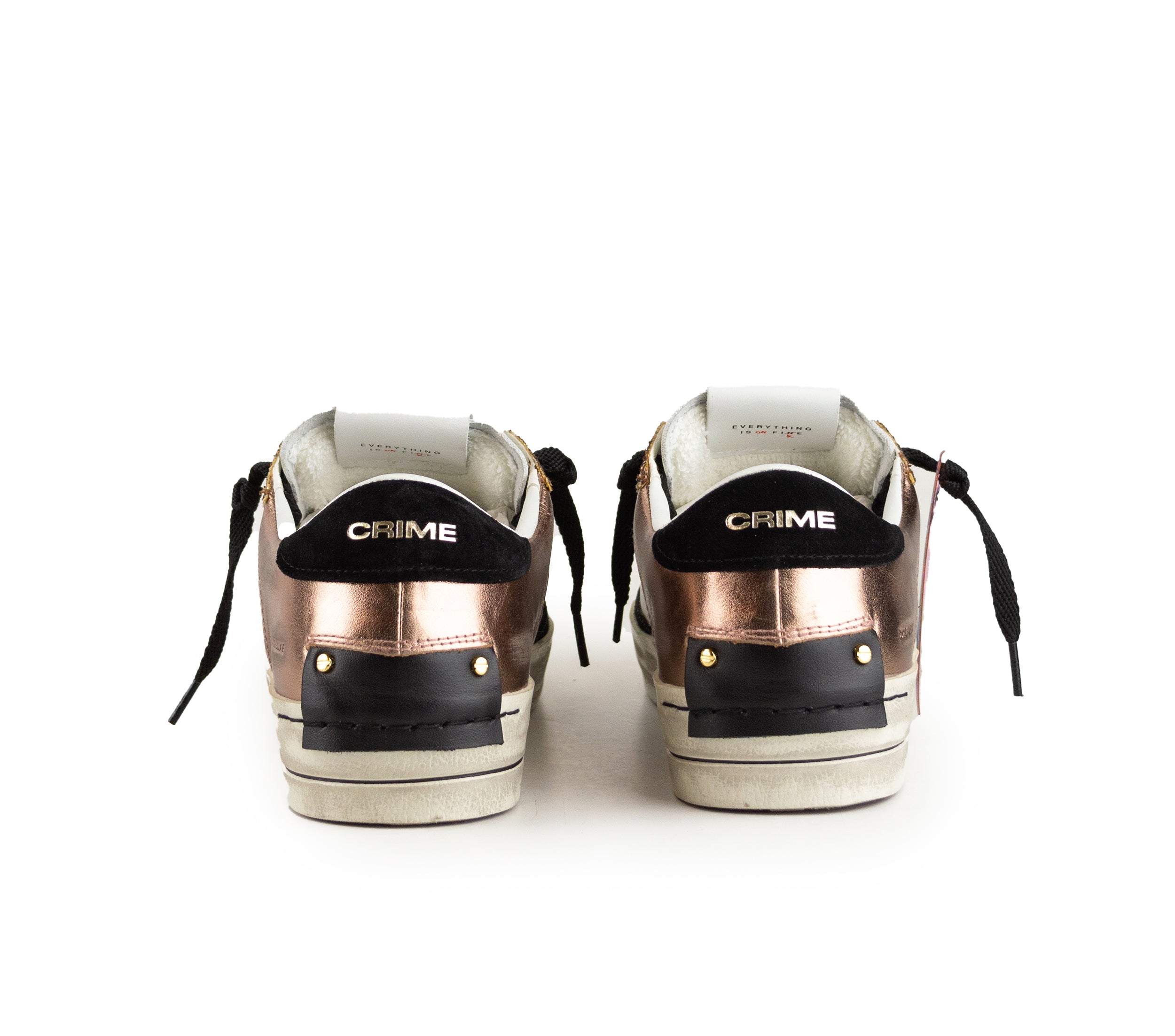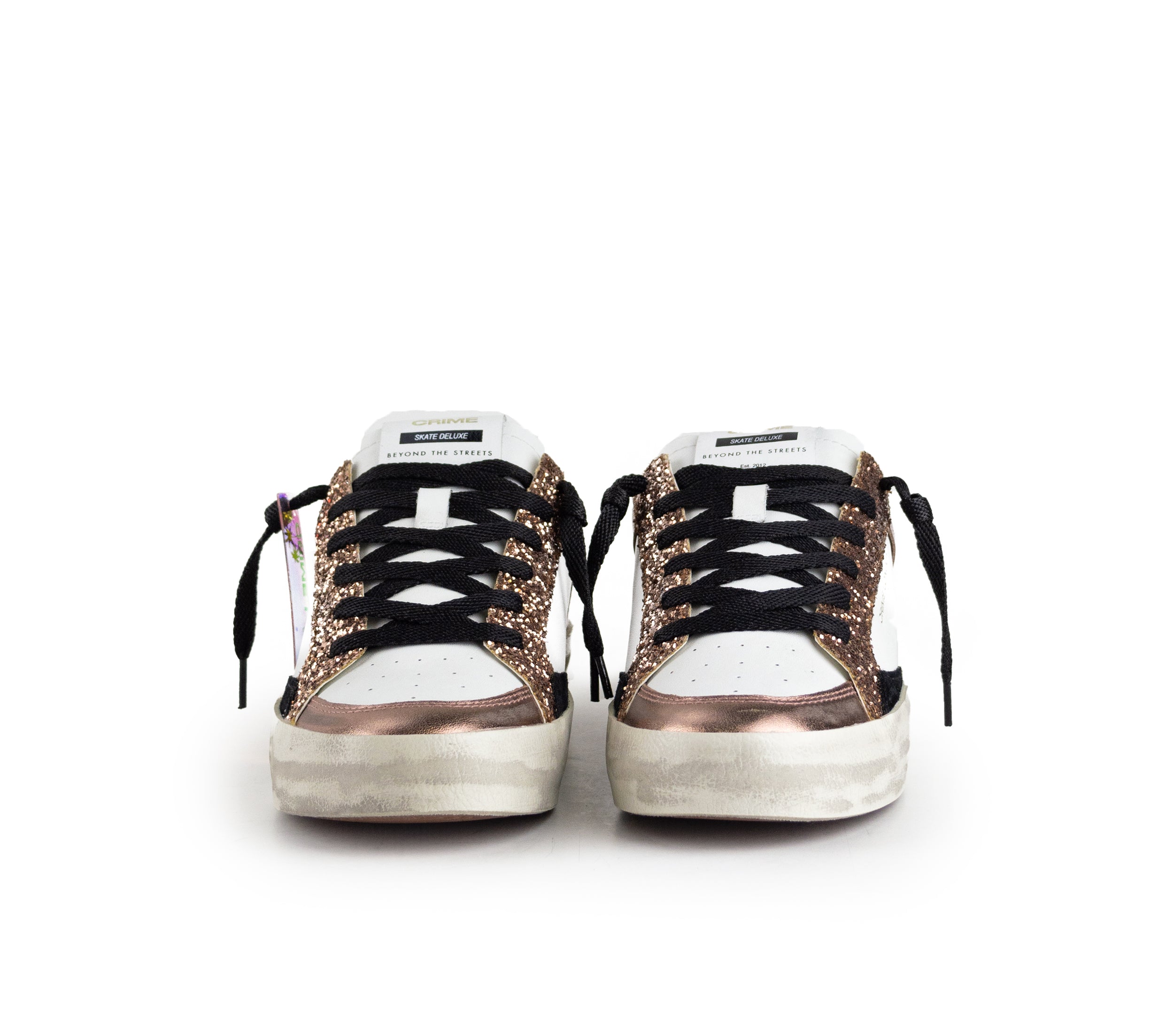 Questa sneaker, realizzata con materiali di alta qualità in Italia, presenta una tomaia in pelle laminata bronzo con dettagli glitter bronzo. Completa il design il tallone in suede nero, la linguetta in pelle bianca con etichetta logo in pelle e un inserto posteriore in pelle nera. I lacci sono in poliestere nero, accompagnati da un'etichetta iridescente, mentre la fodera combina pelle e tessuto. Suola grigio chiaro con fondo miele scuro, altezza 2,5-3,5 cm, finitura vintage e vestibilità regolare.