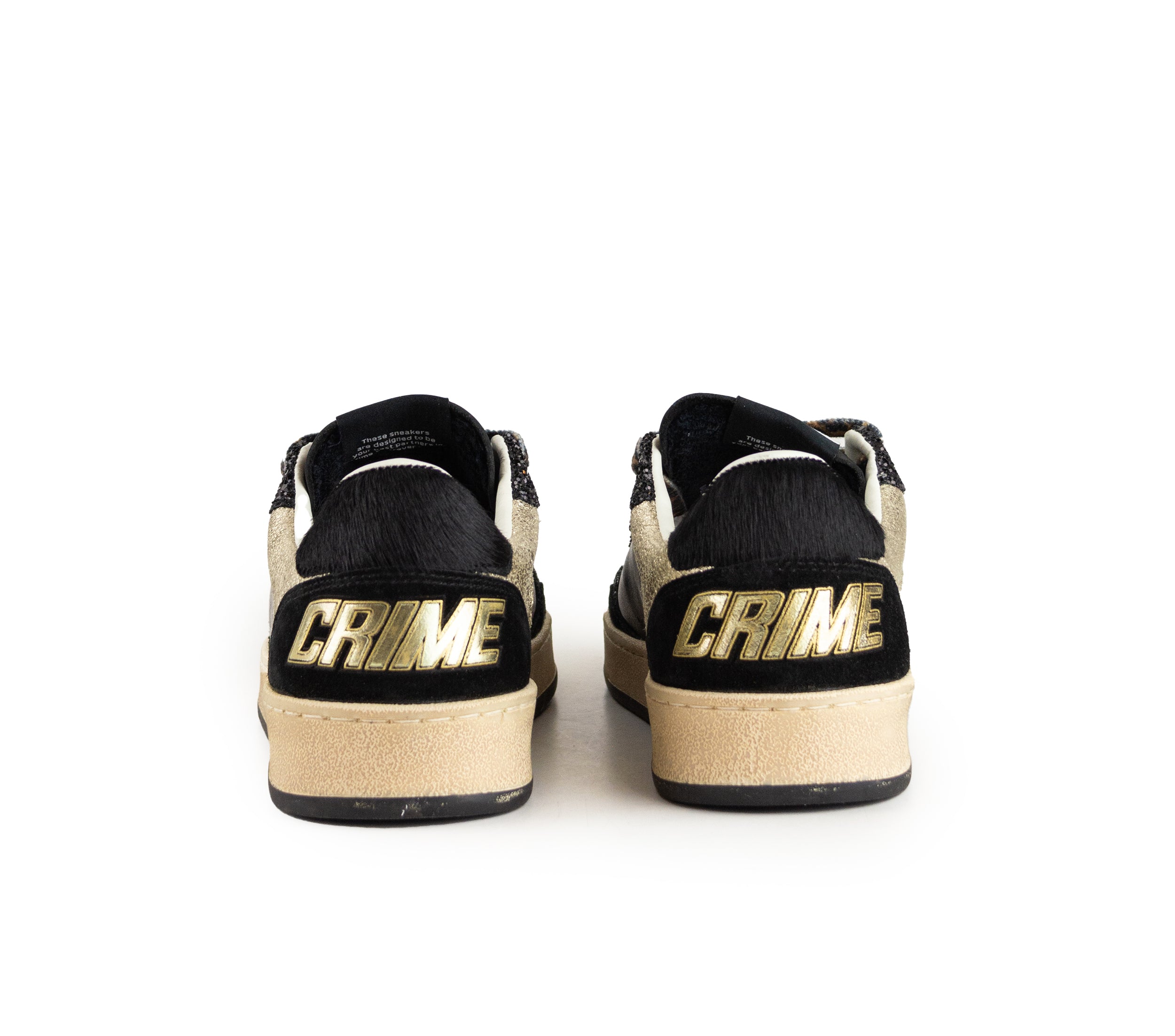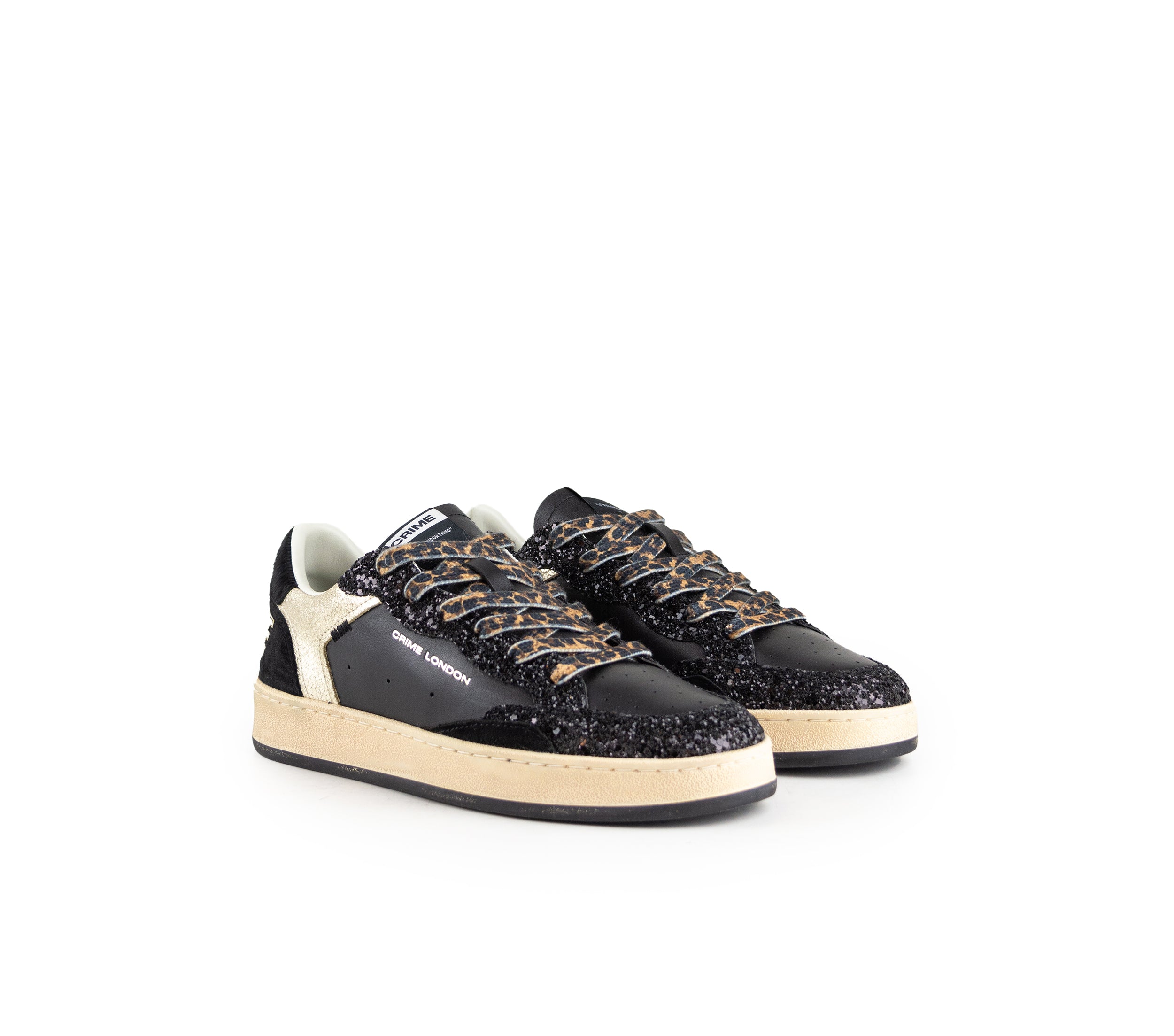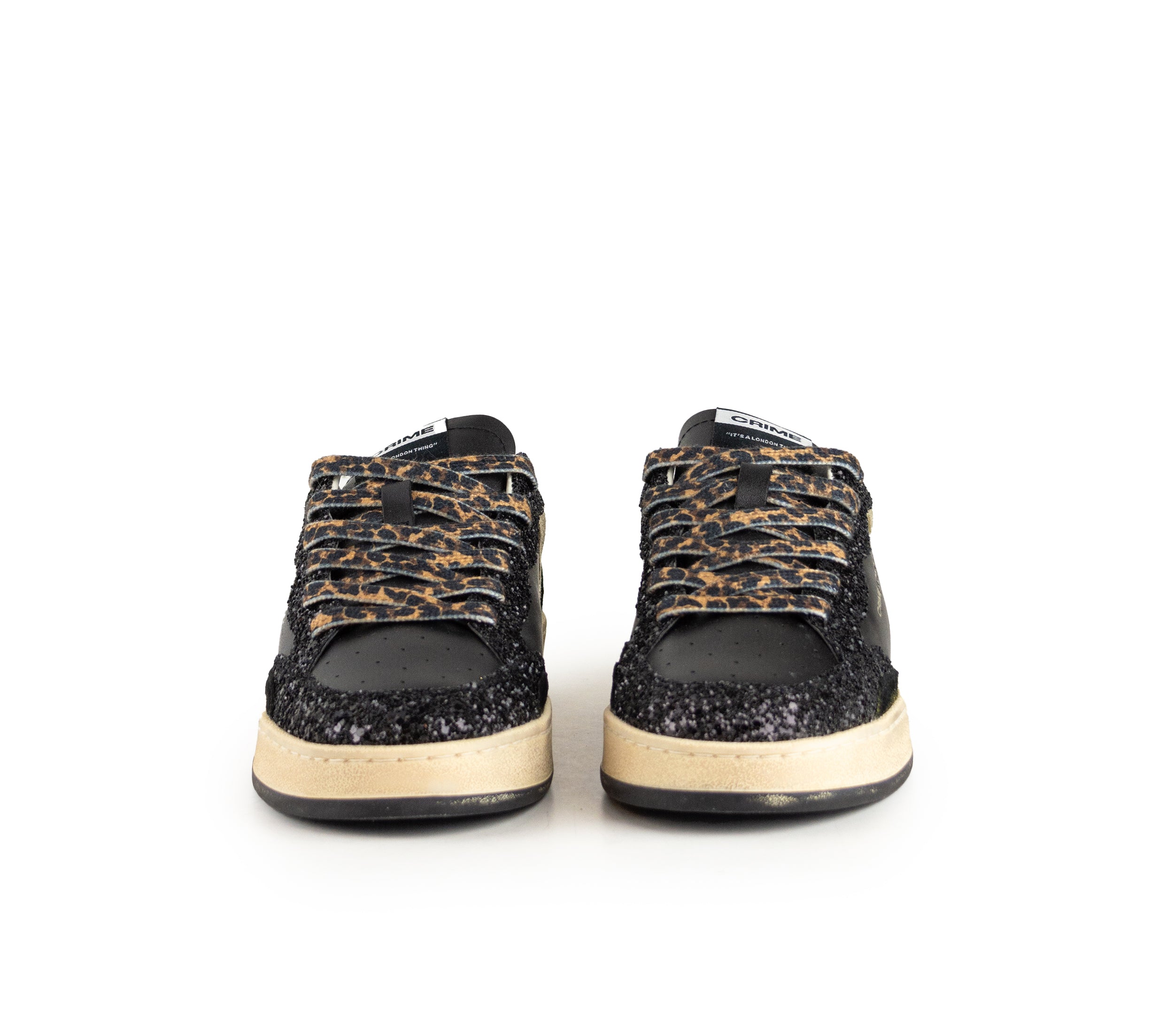 Sneaker realizzata con materiali di alta qualità Made in Italy, presenta una tomaia in pelle nera e glitter. Il dettaglio del tallone in cavallino nero e il tallone in suede con logo CRIME conferiscono un tocco distintivo. La linguetta in pelle nera è arricchita da un'etichetta in tessuto con logo, mentre i lacci in cotone con stampa Leo completano il design. L'interno è foderato con tessuto animalier, abbinato a una suola in gomma beige con fondo nero e altezza tra 2,5 e 3 cm. La finitura vintage e la vestibilità regolare garantiscono stile e comfort senza tempo.