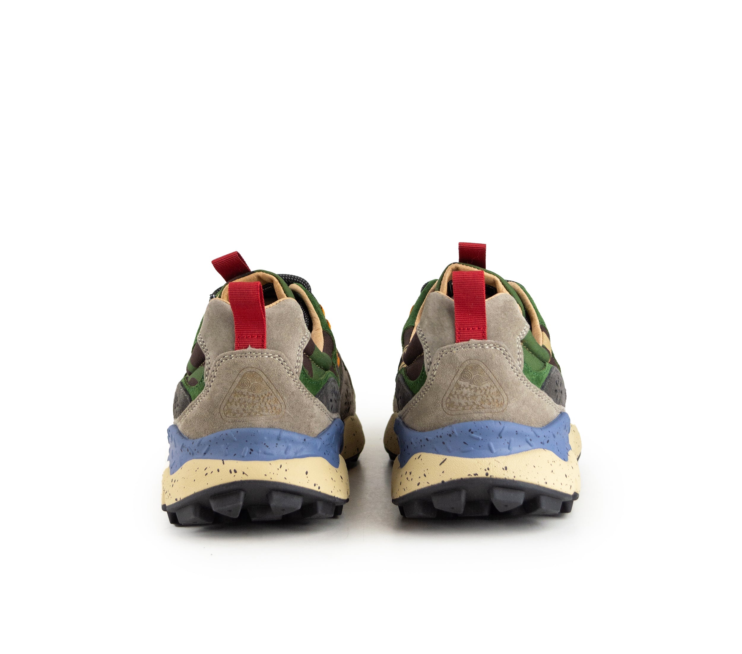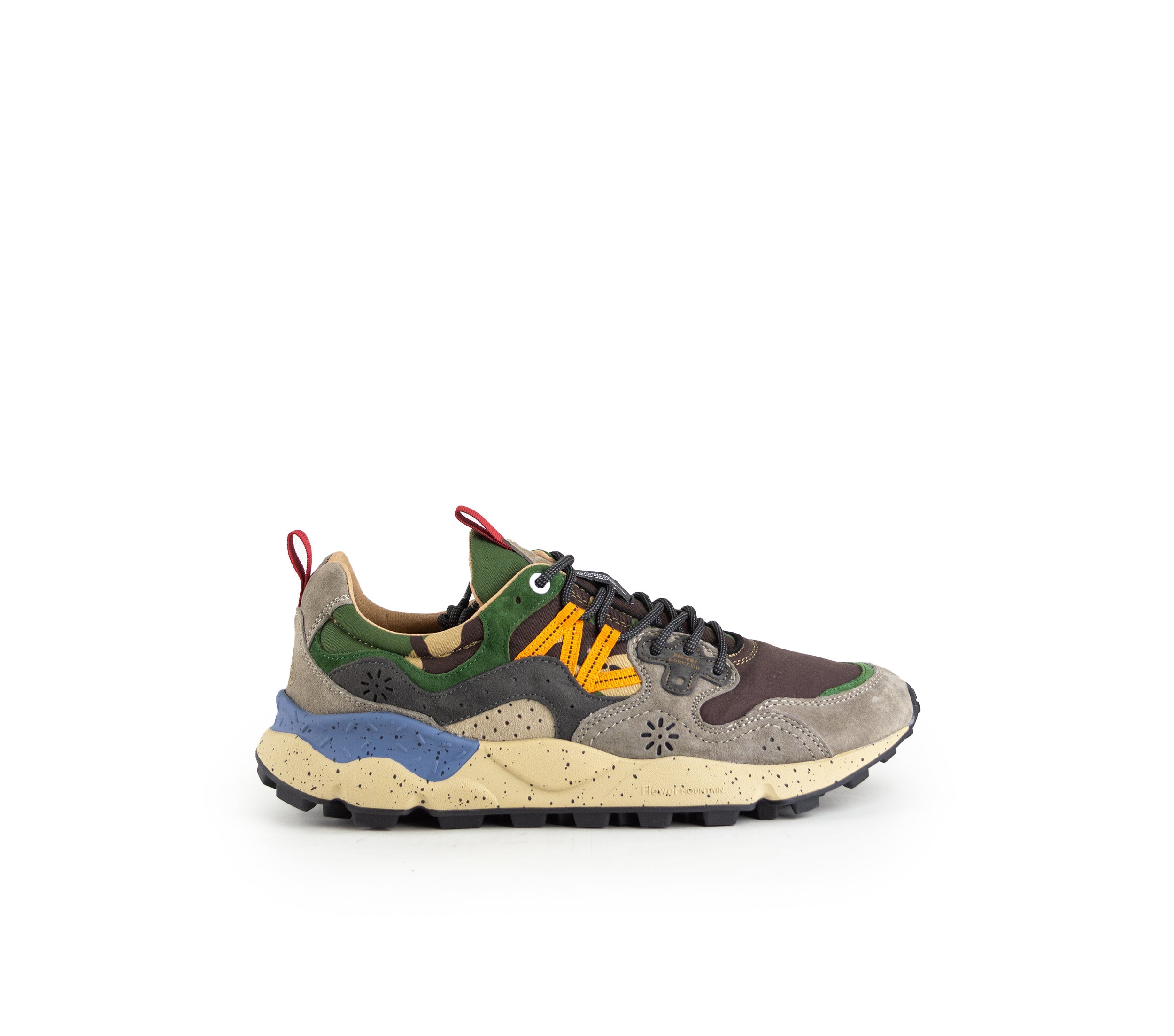 Sneaker realizzata in tessuto tecnico ripstop abbinato a suede multicolore, con chiusura a stringhe trekking bicolore e occhielli esclusivi. Fodera combinata in tessuto e pelle, arricchita da una soletta interna in sughero naturale con proprietà antibatteriche. Suola ultra leggera in gomma con battistrada dentellato per uno stile sofisticato e performance elevate.