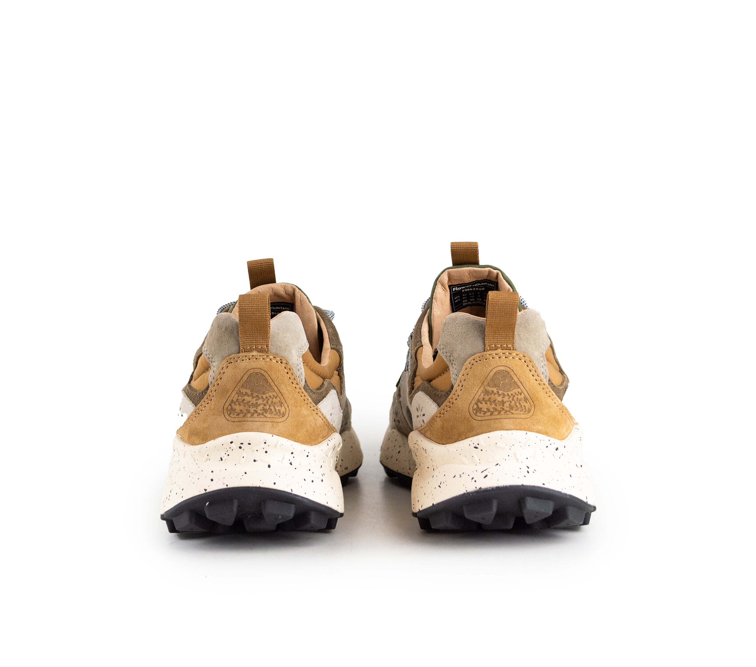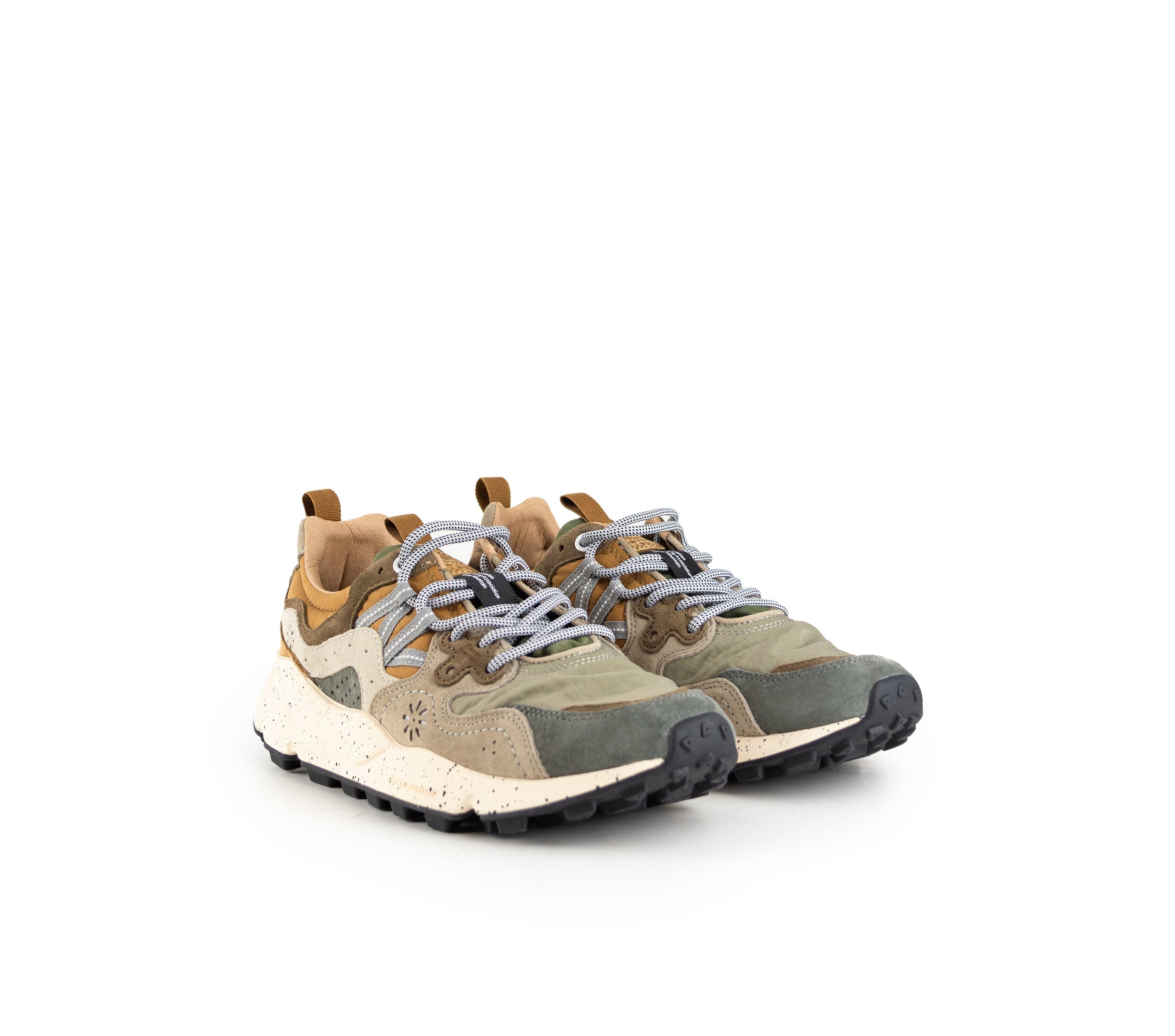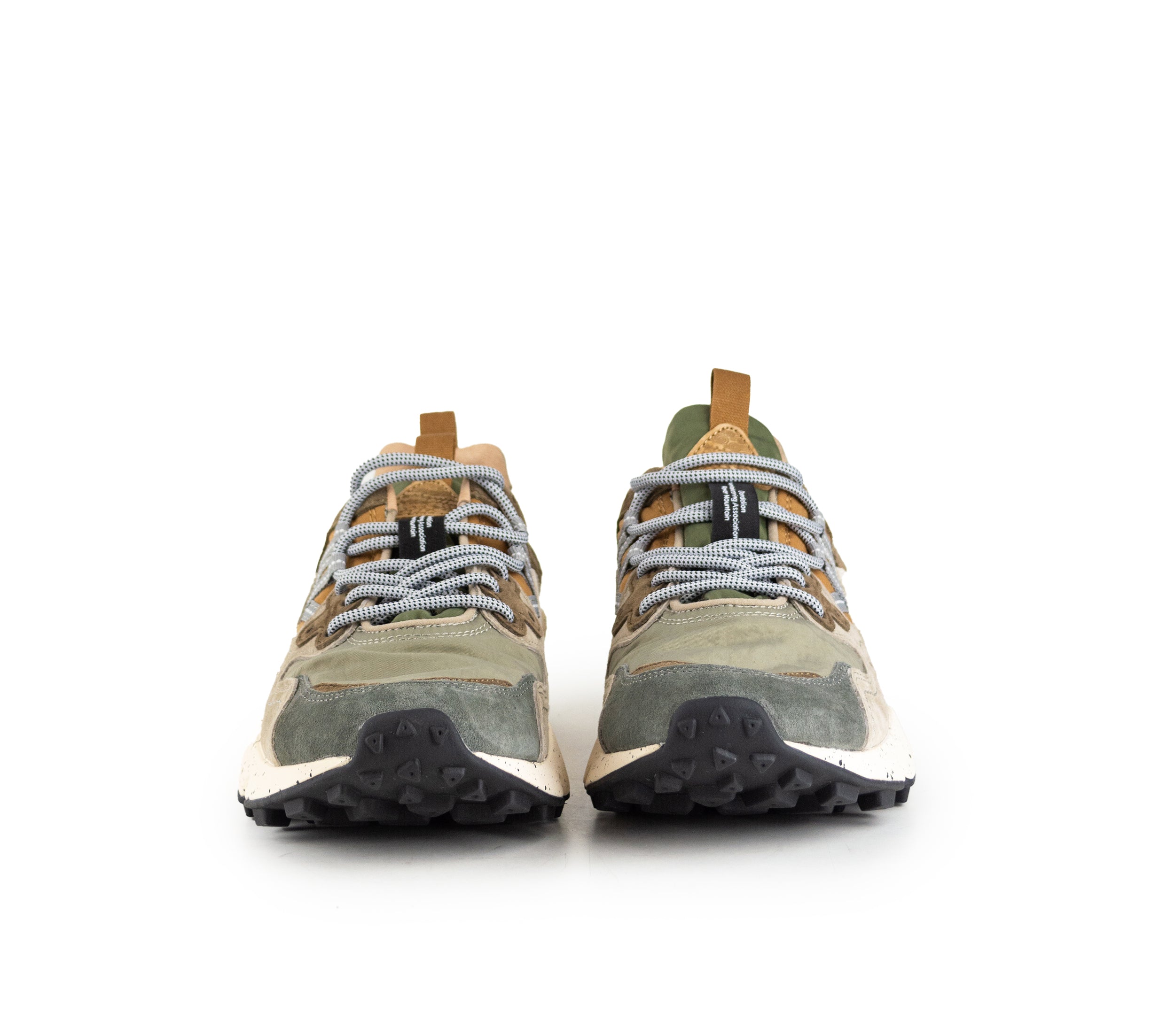 Sneaker realizzata in tessuto tecnico ripstop e suede multicolore, caratterizzata da una chiusura con stringhe trekking bicolore e occhielli esclusivi. Interni in tessuto e pelle, con una soletta interna in sughero naturale antibatterico per il massimo comfort. Suola in gomma ultra leggera con grip dentellato, perfetta per un look sofisticato e dinamico.