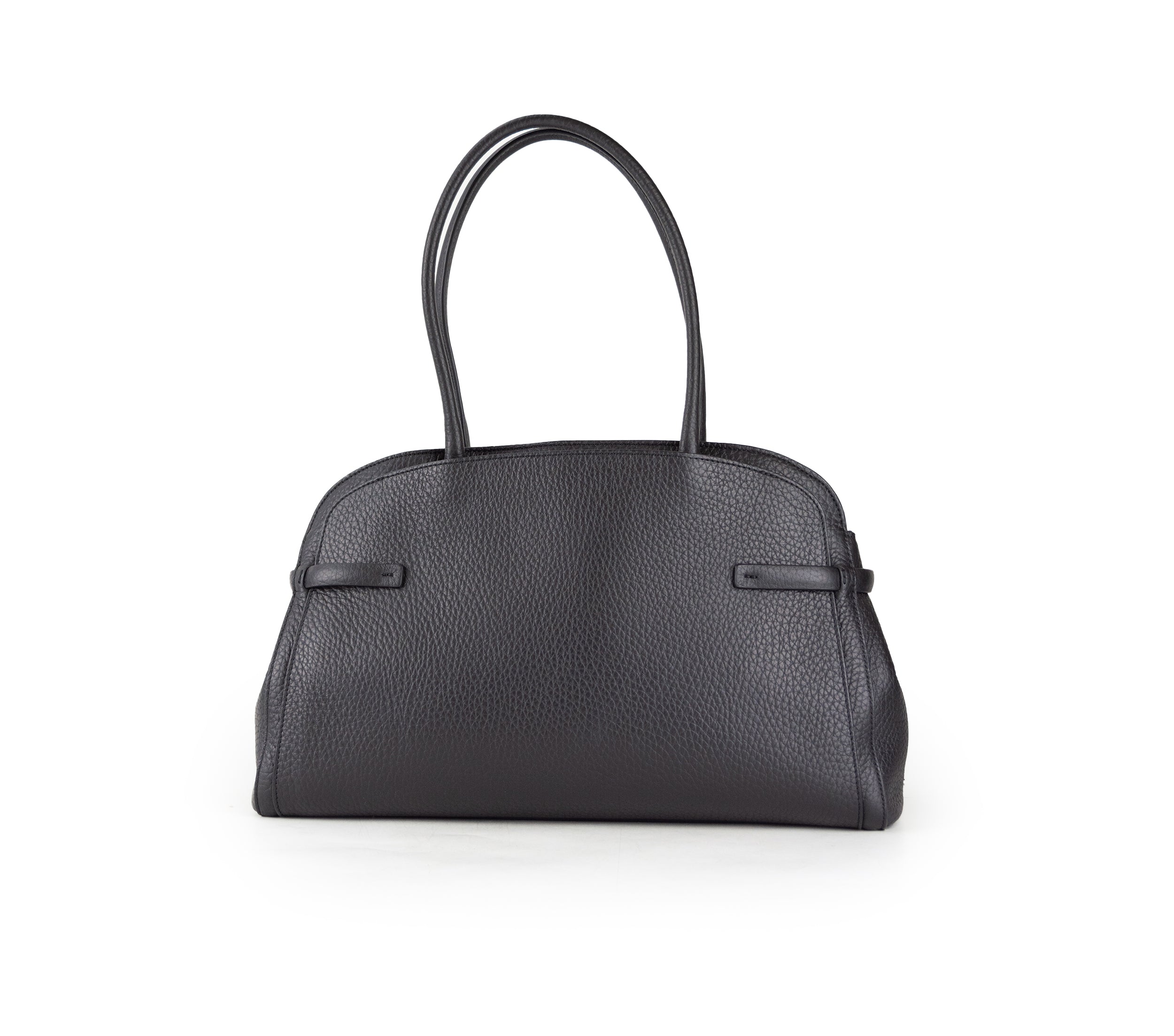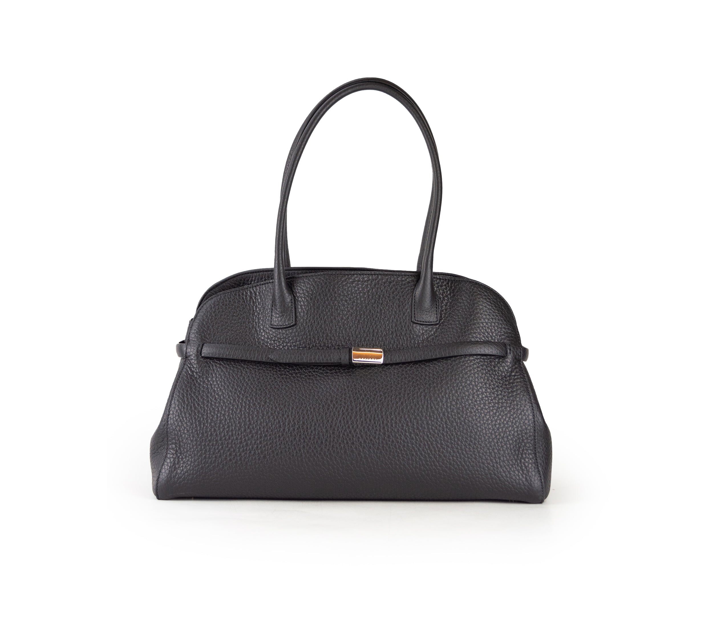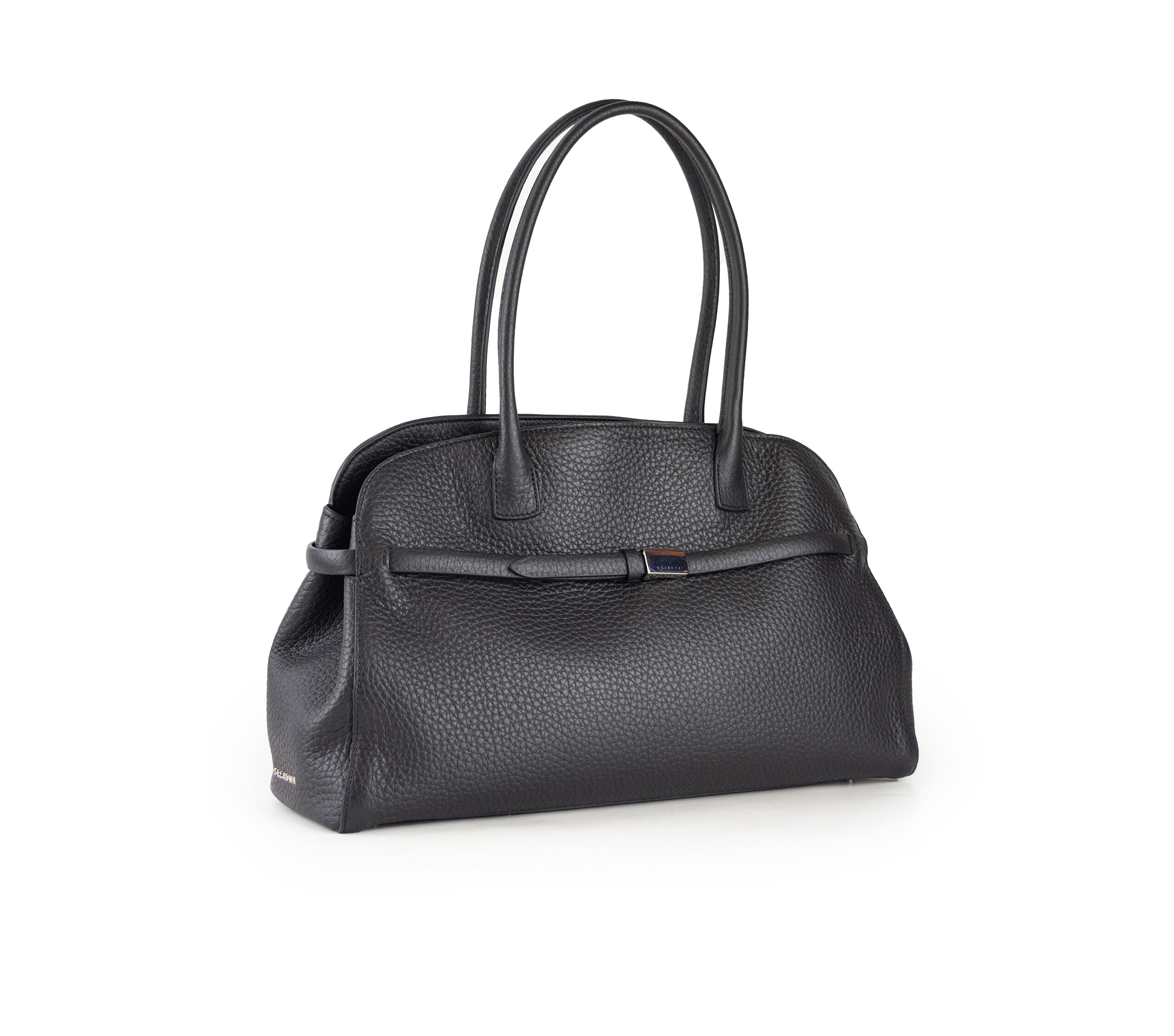 La raffinata borsa a mano Orciani in pelle martellata si caratterizza per un design classico e intramontabile. Dotata di doppi manici sottili e di una comoda chiusura con zip che protegge il comparto principale, presenta sulla parte anteriore una fascia decorativa arricchita da dettagli metallici. Interamente realizzata in Italia, questa borsa rappresenta l’unione perfetta tra eleganza e praticità.