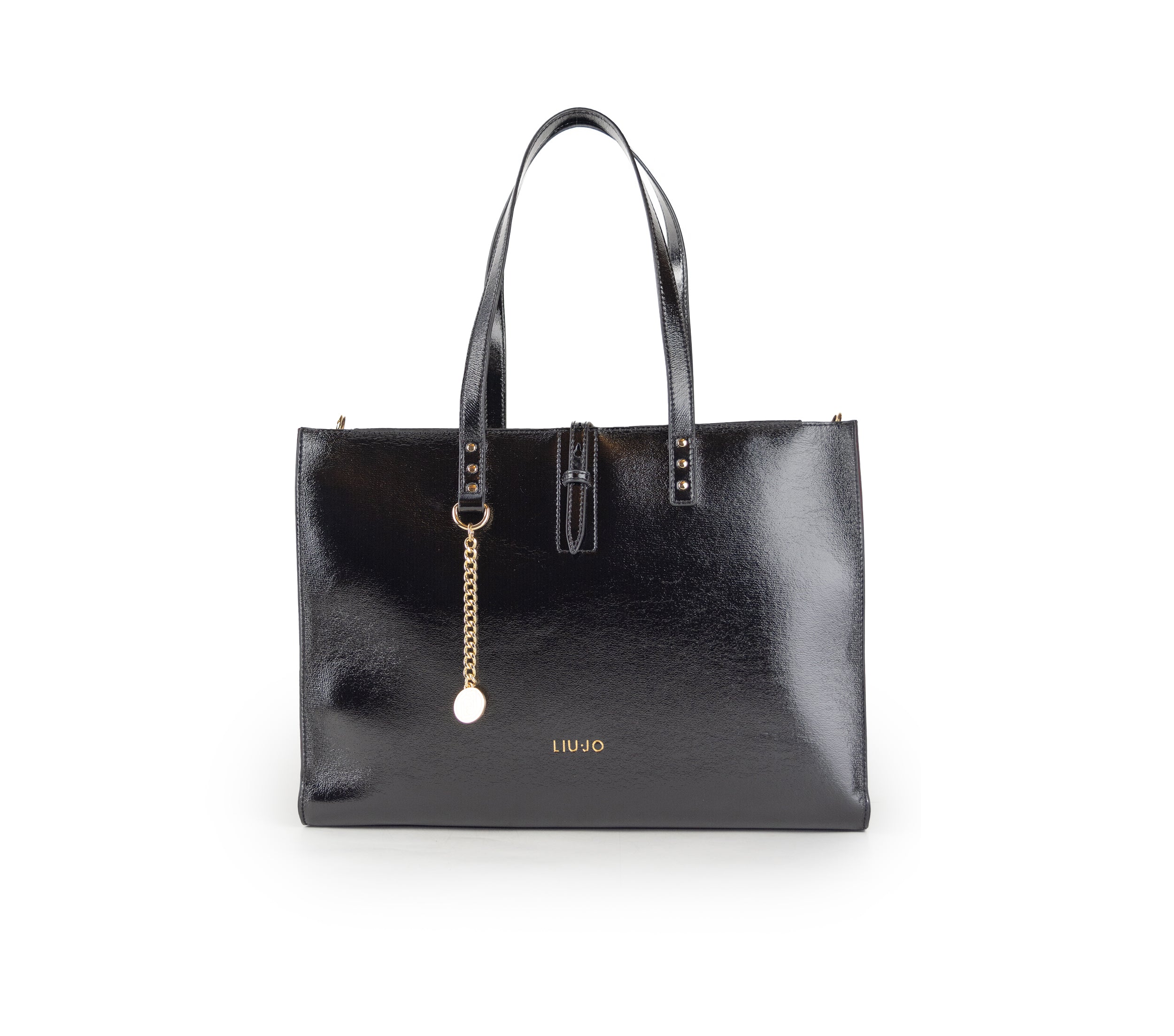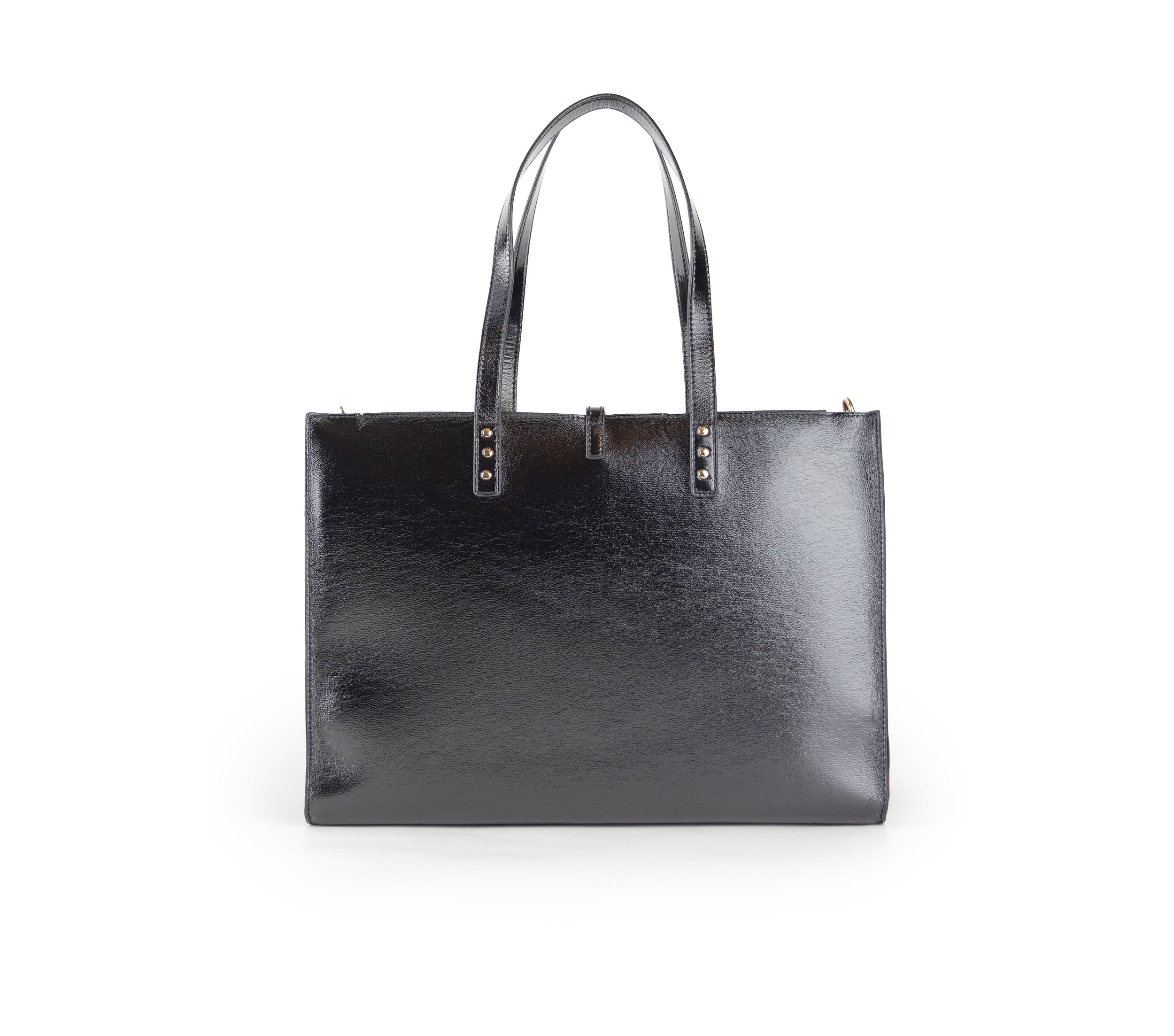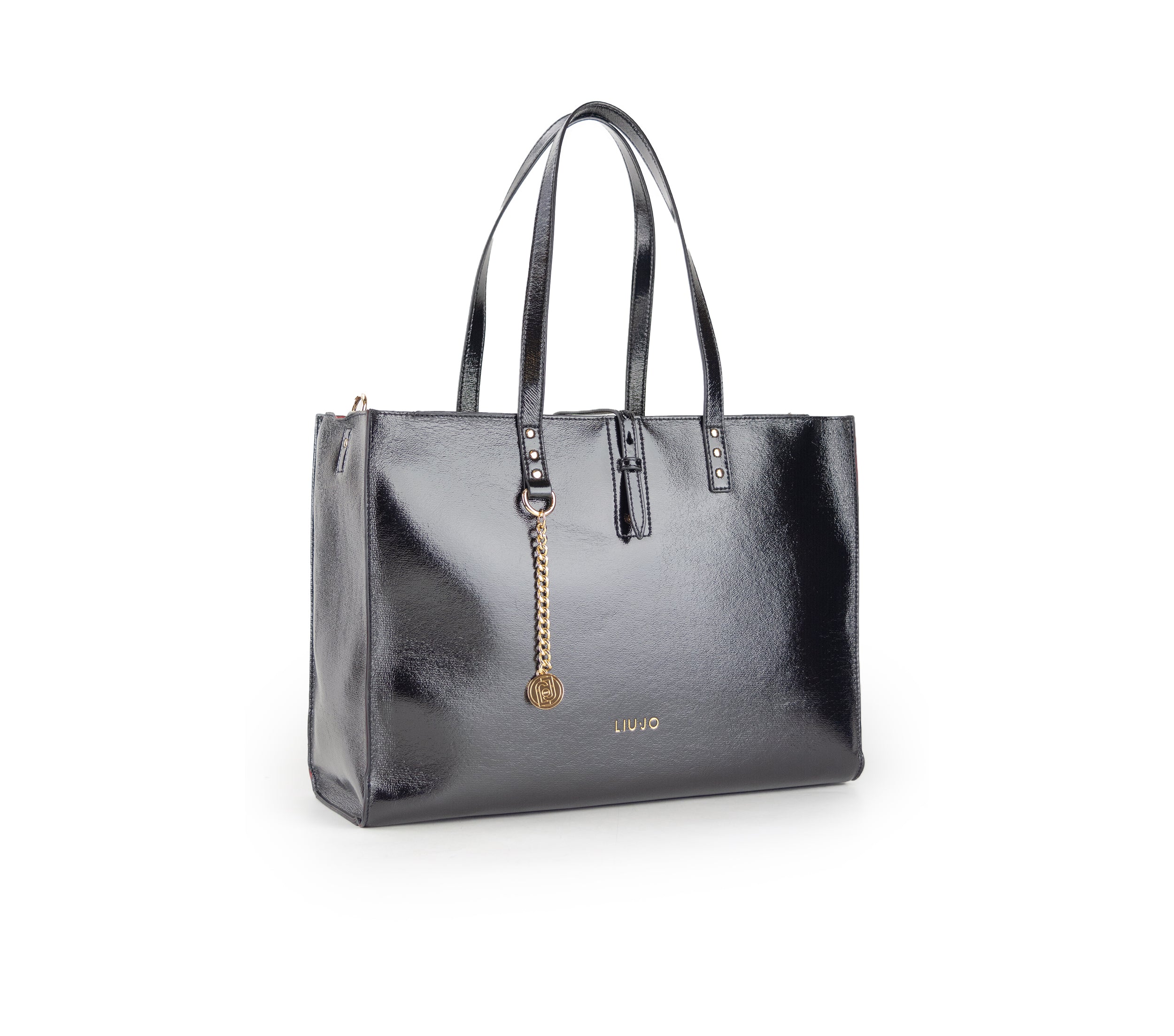 Shopping bag lucida con mini borchie applicate e logo in metallo. Dotata di manici confortevoli, tracolla rimovibile e regolabile. Charm logato con catena aggiunge un tocco distintivo. Chiusura zip con cinturino e fodera a contrasto. Questo accessorio versatile si può portare comodamente a spalla o a tracolla.